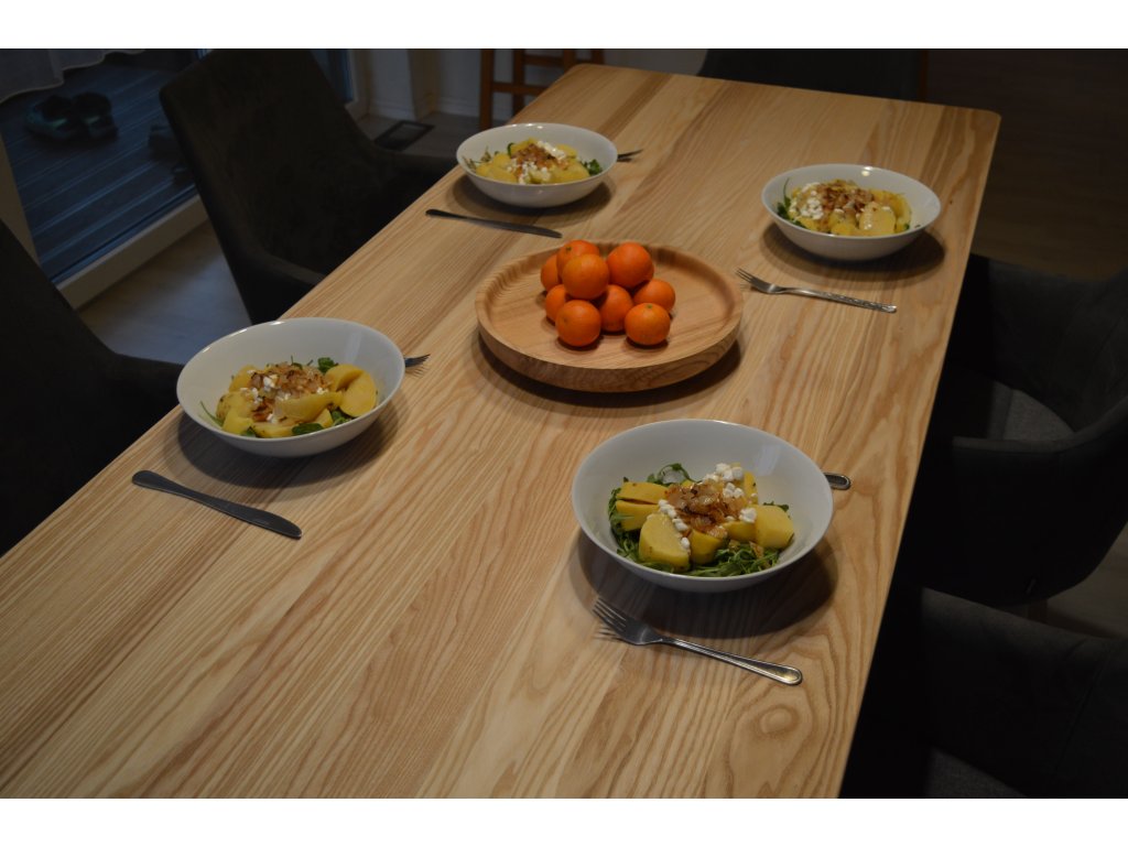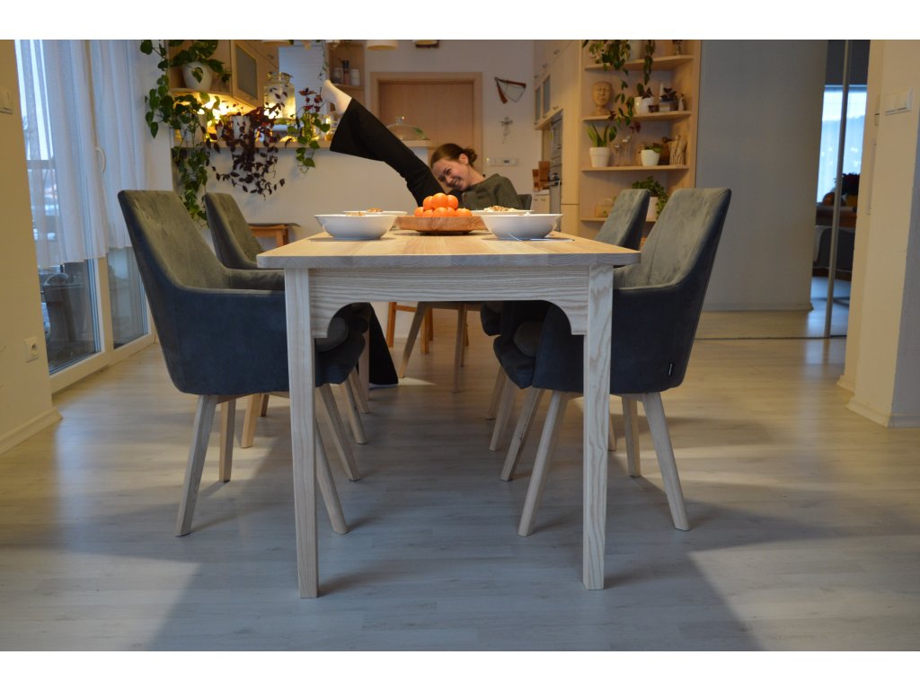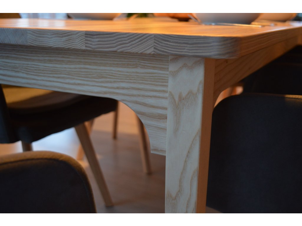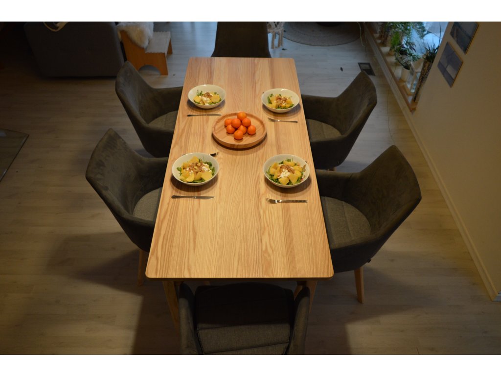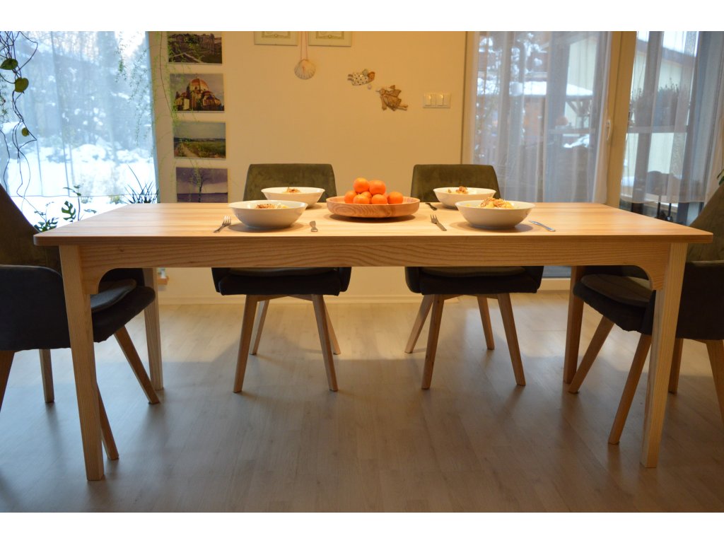Jídelní stůl z jasanového (velmi pružného) dřeva pro 6 osob 180x67x75cm. Stůl je složen z nohou, lubů a hlavní stolové desky. Nohy s luby jsou spojeny klasickým spojem "čep a dlab". Přesně tak jak to dělávali naši předci, kteří dobře věděli co vydrží dlouhá léta. Nohy společně s luby vytváří takzvanou "podnož", která nese hlavní stolovou desku. Hlavní deska je k podnoži upevněna kolíkovým spojem. Stůl neobsahuje žádné kovové prvky.